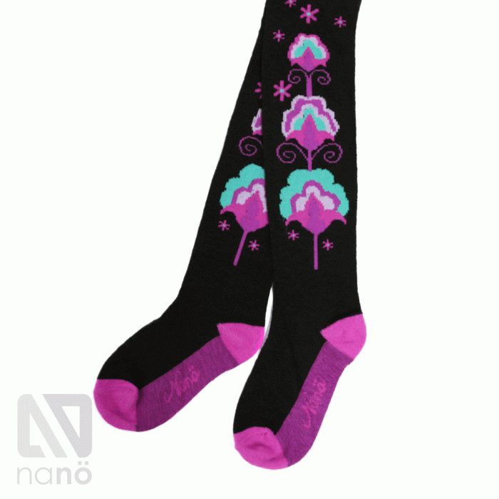 Тонкие мягкие хлопковые колготки для девочек черного цвета с узором в фиолетовых тонах сбоку на голени.