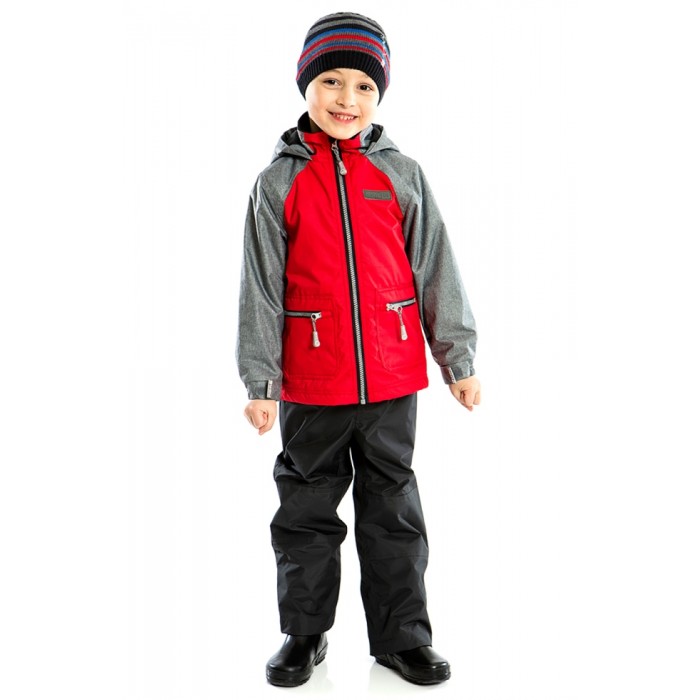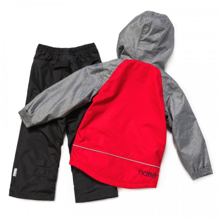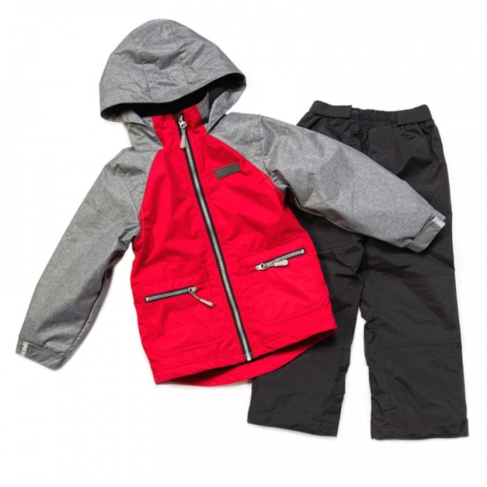 Ветрозащитный, непромокаемый и дышащий комплект на весну-осень, или рейнсьют (rainsuit): ярко-красная куртка на флисе с серебристо-серыми рукавами и капюшоном и брюки на трикотажной подкладке практичного темно-серого цвета.