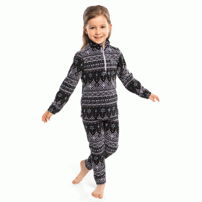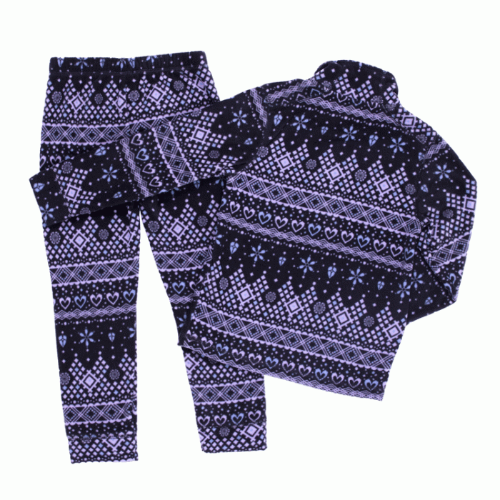 Флисовый костюм для девочки с узором: свитерок с короткой молнией и брючки на резинке. Плотный эластичный пушистый материал, стильный дизайн и цветовая гамма: на черном фоне причудливый узор в лиловых тонах.