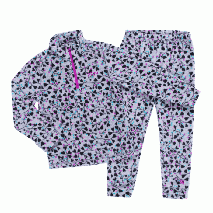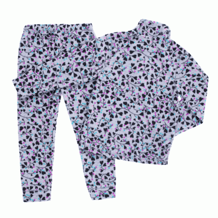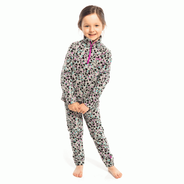 Флисовый костюм для девочки: свитерок с короткой молнией и брючки на резинке. Плотный эластичный пушистый материал, нежный и стильный дизайн и цветовая гамма: на серебристо-сером фоне темно-серые лепестки, ярко-бирюзовые и розово-фиолетовые ягодки.
