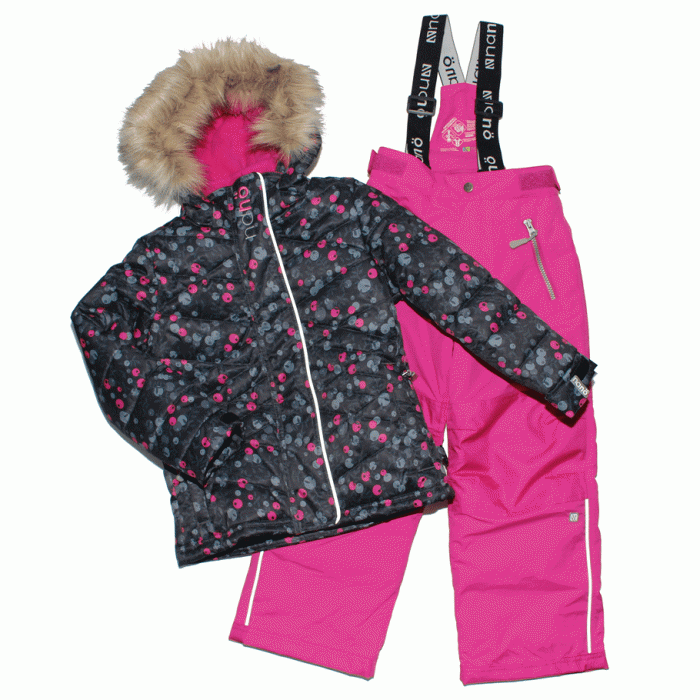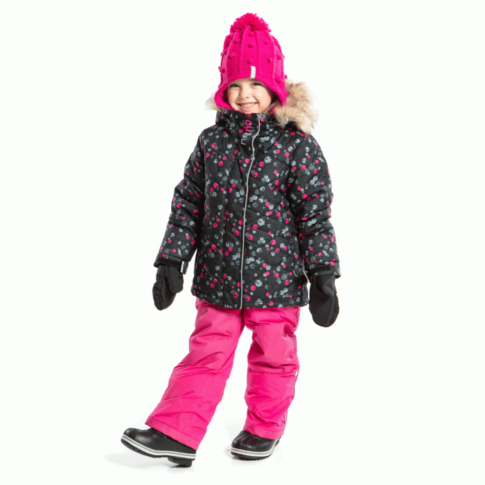 Термокомбинезон для девочки - яркий, красивый, жизнерадостный дизайн: куртка со стеганными полосками, на черном фоне разбросаны ярко-розовые ягодки, серые ягодки и маленькие серенькие еле заметные листики. Яркий полукомбинезон такого-же ягодного цвета. Светло-серый пушистый искуственный мех на капюшоне и светоотражающая полоса на защитной планке молнии. Комплект прекрасно смотрится, особенно на фоне серо-белого зимнего пейзажа.