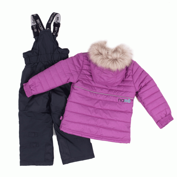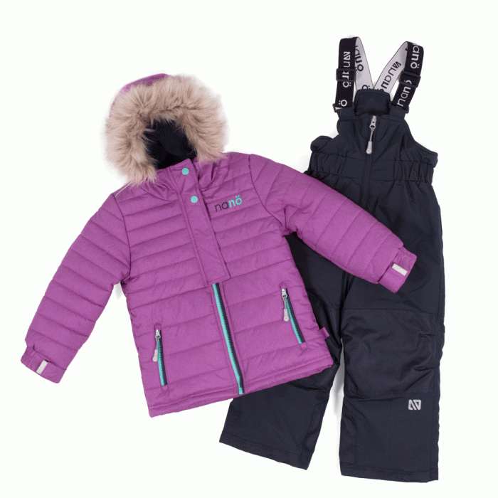 Термокомбинезон для девочки: стеганная куртка яркого светло-фиолетовго цвета петуньи, пушистый серо-бежевый мех на капюшоне и темно-синий полукомбинезон. Очень украшают комбинезон ярко-голубые молнии на вшитых боковых кармашках спереди и две буквы логотипа NANO сзади. Защитный клапан молнии спрятан внутрь, наружная укороченная планка, закрывающая молнию в вехней части куртки, несет декоративную функцию.