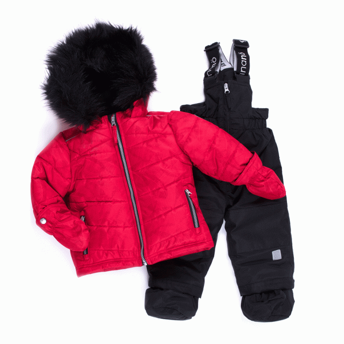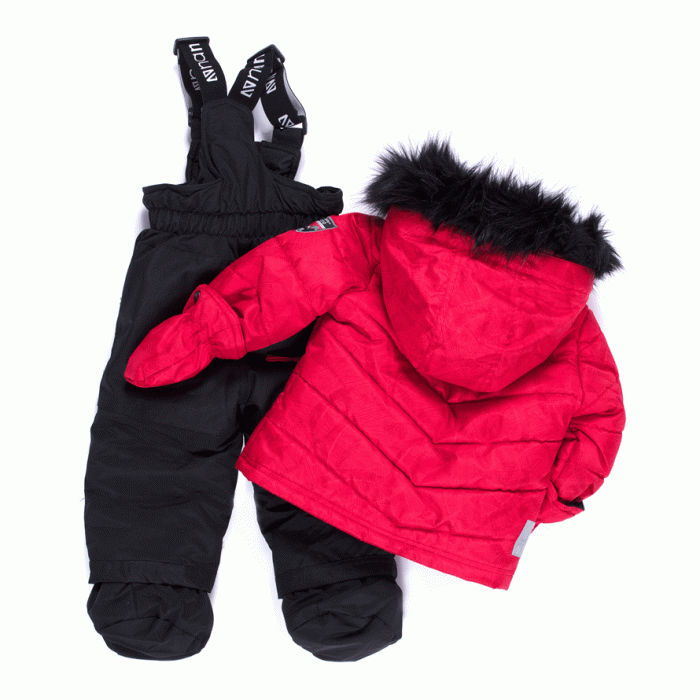 Термокомбинезон (snowsuit) для девочки очень красивого и насыщенного ярко-малинового цвета. Пушистый черный мех на капюшоне отстегивается. Защитный клапан молнии спрятан внутрь. Полукомбинезон черного цвета.