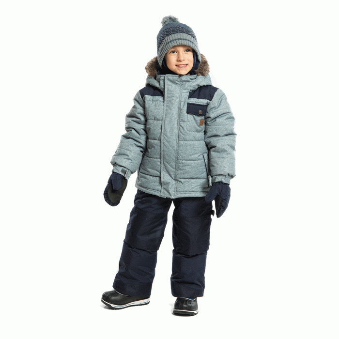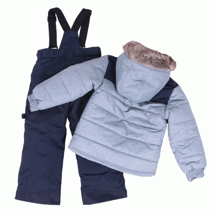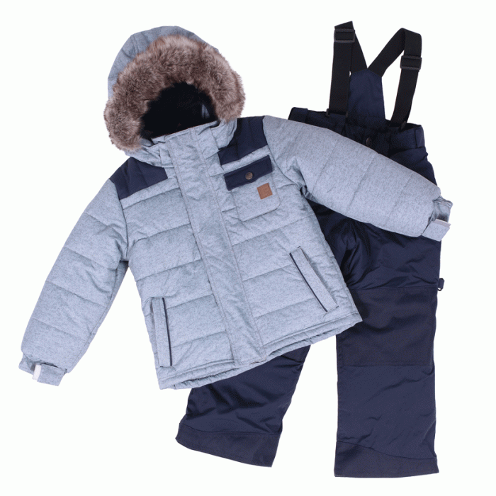 Красивый, теплый и очень удобный комплект верхней одежды для мальчика на зиму. Куртка цвета серого мрамора с эффектом "меланж" украшена темно-синими вставками на плечах. Пушистый серый-бежевый искуственный мех на капюшоне смотрится очень тепло и уютно. Полукомбинезон на бретелях практичного темно-синего цвета.