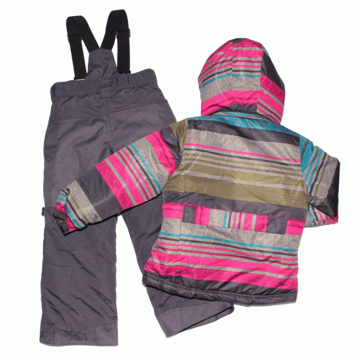 Красивый, теплый и стильный комплект верхней одежды для девочки на зиму. Очень необычная цветовая гамма. В куртке сочетаются ярко-розовый, серый, бирюзовый, и изюминка цветовой гаммы - цвет зеленого аметиста. Расположенные хаотично полосы разной ширины разных цветов смотрится очень целостно и гармонично. На груди небольшая вышивка. Защитная планка молнии украшена разноцветными кнопками. Полукомбинезон практичного серо-гранитного цвета.