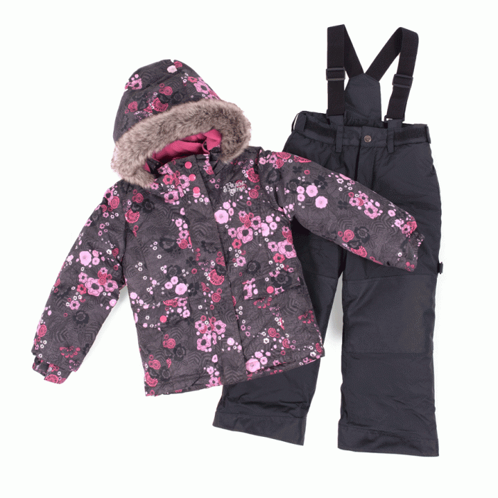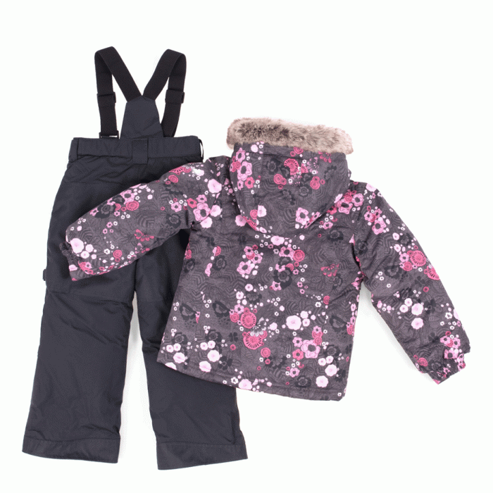 Красивый, теплый и очень удобный комплект верхней одежды для девочки на зиму. На фоне цвета серого камня - нежный цветочный принт, оттенки от преламутрового розового до насыщенного персикового. Узор из темно-серых лепестков придает принту изысканности. Капюшон украшает пушистый серо-бежевый искуственный мех. Флисовая подкладка насыщенного персикового цвета. Полукомбинезон на бретелях практичного темно-серого цвета.