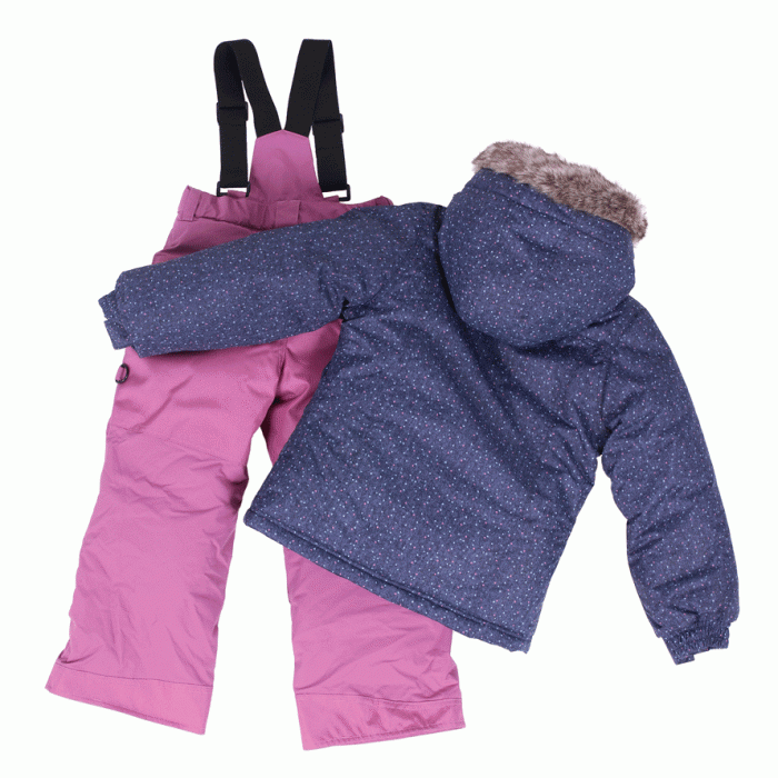 Красивый, теплый и очень удобный комплект верхней одежды для девочки на зиму. Куртка дымчатого сине-стального цвета, принт "конфетти": мелкий горошек лавандового и светло-серогов цветов. Молнии на вшитых боковых кармашках, кнопки на ветрозащитной планке и маленькое вышитое сердечко нежного светло-сиреневого цвета очень украшают куртку. Пушистый серо-бежевый искуственный мех на капюшоне смотрится очень тепло и уютно. Флисовая подкладка и полукомбинезон на бретелях цвета "дымчатый крокус".